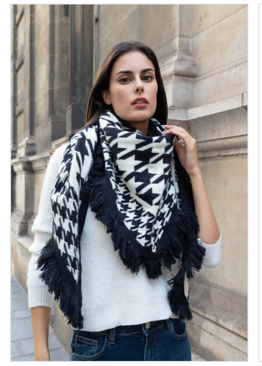 Écharpe triangle épaisse noire et blanche avec franges noires et motifs pied de poule.