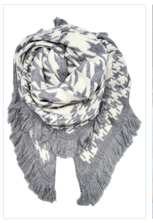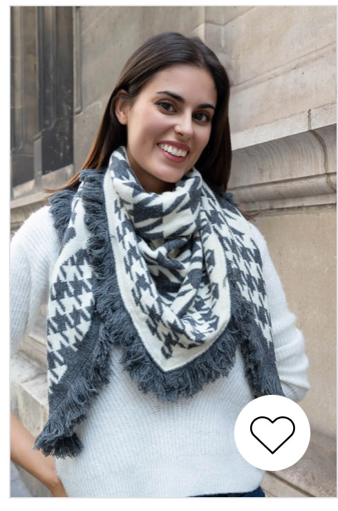 Écharpe triangle épaisse grise et blanche avec franges grises et motifs pied de poule.
