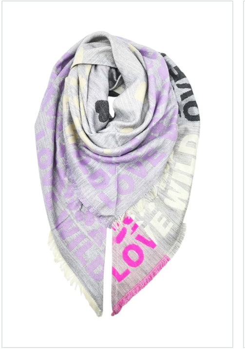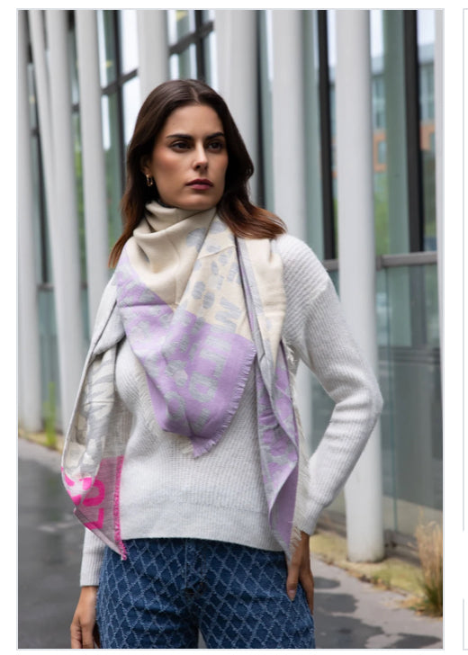 Écharpe triangle double face de couleurs grise, violette, noire et rose. Les bords sont légèrement frangés ajoutant une texture douce et une belle finition.